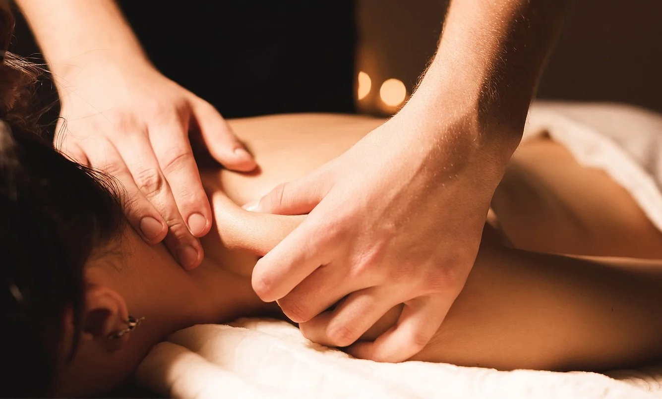 Deep tissue techniques with myofascial release. Deliberately targets tightness in the upper back, neck, pectoral, facial, quick intra-oral (with gloves) jaw muscles and scalp.